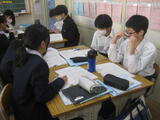 「理解し合うために」を主題に、寛容な心をもって相互理解しようとする態度を育てることをねらいにした道徳でした。中学生(13歳の女性)、お年寄り(75歳の男性)、若者(28歳の女性)が電車の座席をめぐってやりとりする資料「三人の乗客」が取り扱われました。4人グループで、ロールプレイをする場面がありました。お年寄り役の生徒は「優しさにふれた」、中学生役の生徒は「勇気をもって『譲ります』を言いたい」、若者役の生徒は「中学生より先に譲れなかった自分は恥ずかしい」など、役割演技により様々な立場の人の考えに触れることができました。