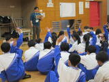 武道場では、障がいをどのように考えたらよいか、お互いをリスペクトできる社会を作っていくには…というお話をクイズ等を交えて楽しく、しかし真剣に学ぶことができました。新座市の中学生は約4000人。障がいを持つ方は…約8000人…「ええ~っ!」と驚く声もありました。障がいだけでなく、ベビーカーや妊婦さん、高齢者についても考えました。