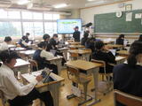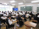 どのくらい学習が定着しているか、全国の中3が取り組んでいます。英語は、ヘッドセットを付けてiPadで実施。